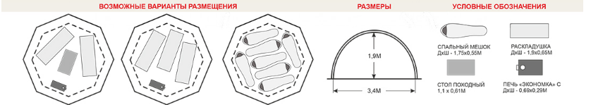 Вместимость палатки до 5 человек при условии размещения в спальных мешках, без установки отопительного прибора (печи).